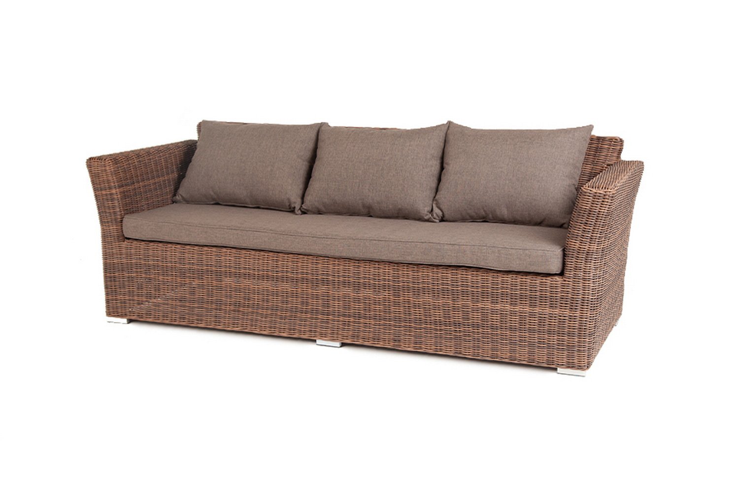 Отделка трехместного дивана Капучино выполнена с помощью переплетения искусственного ротанга коричневого цвета. Цвет отделки – коричневый, универсальный для любого интерьера, а ее материал позволит оставить диван на улице почти на все сезоны.
