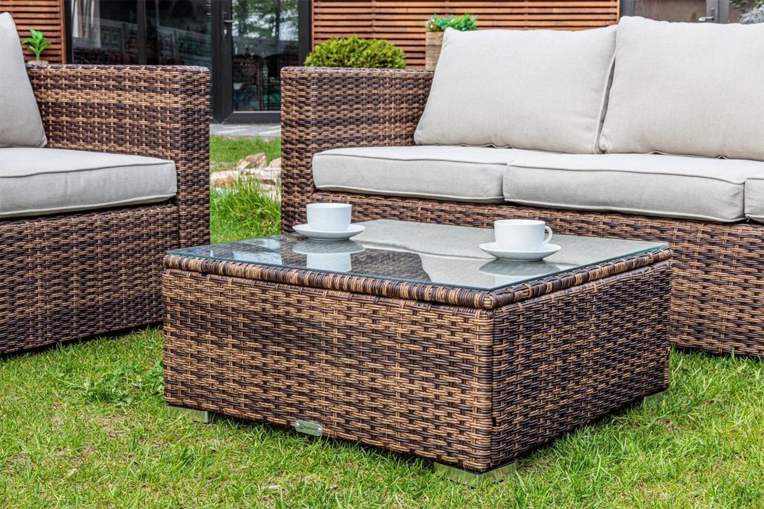 Вся мебель состоит из стального каркаса, оплетенного искуственным ротангом коричневого цвета. Спинки кресел и дивана низкие, имеют прямую форму. Присутствуют широкие подлокотники. Низкая мебель не привлекает внимание и не крадет пространство. Размеры мебели: стол - 165х69х90 см, кресло (в наборе 2 штуки) - 85х66х84 см, диван - 204х66х84 см. Форма стола – прямоугольная, столешница состоит из плотной оплетки, покрытого прозрачным стеклом.